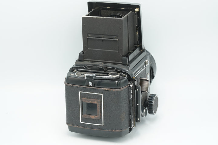 This camera comes with a Sekor-C 90mm f3.8 lens (50mm full frame equivalent), a 120mm film back and a waist finder.